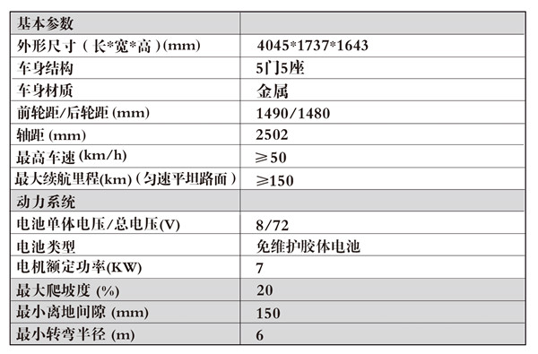 整體車身采用鋼板沖壓成型,車身經陰極電泳處理。具有語音裝置,運用蓄電池,是一種高效、節能、低噪音、零排放的綠色執法用車。