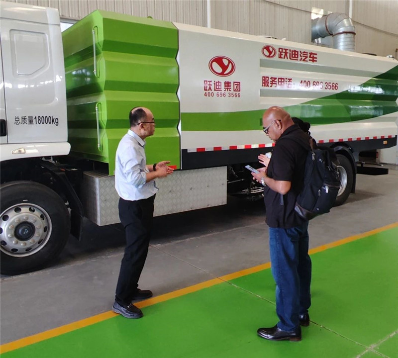 躍迪集團副總裁崔清學向美國客商Tony Joseph介紹了躍迪集團自主研發(fā)的躍迪純電動洗掃車。