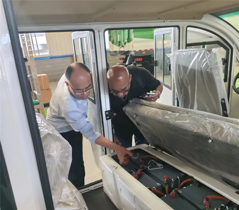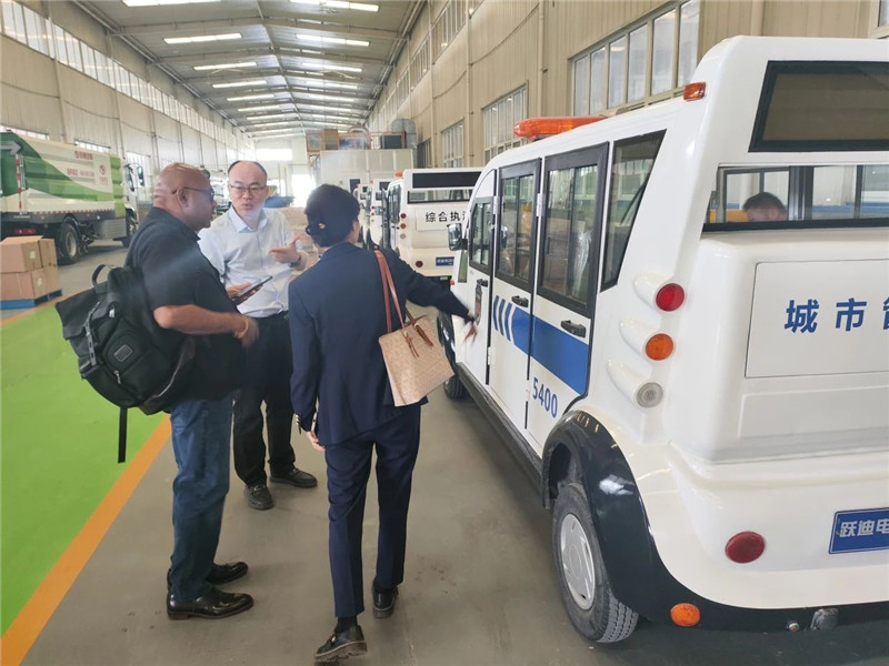 躍迪集團副總裁崔清學向美國客商Tony Joseph介紹了躍迪集團自主研發(fā)的躍迪純電動巡邏車。